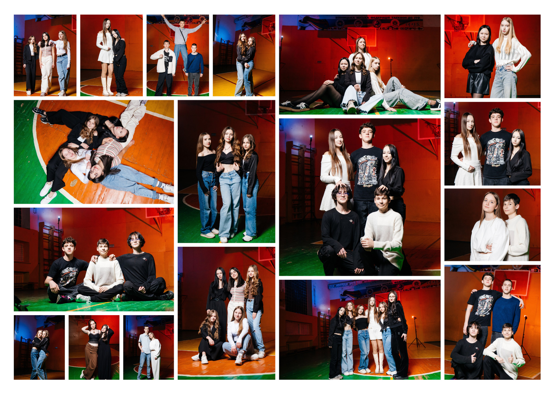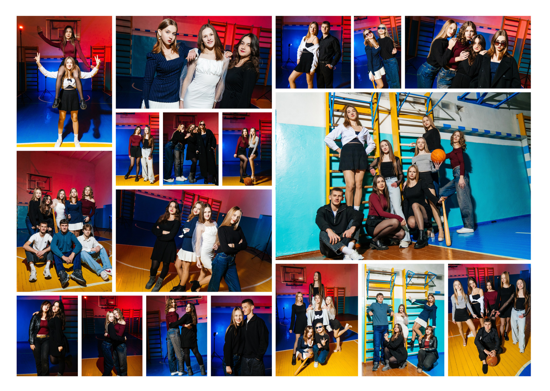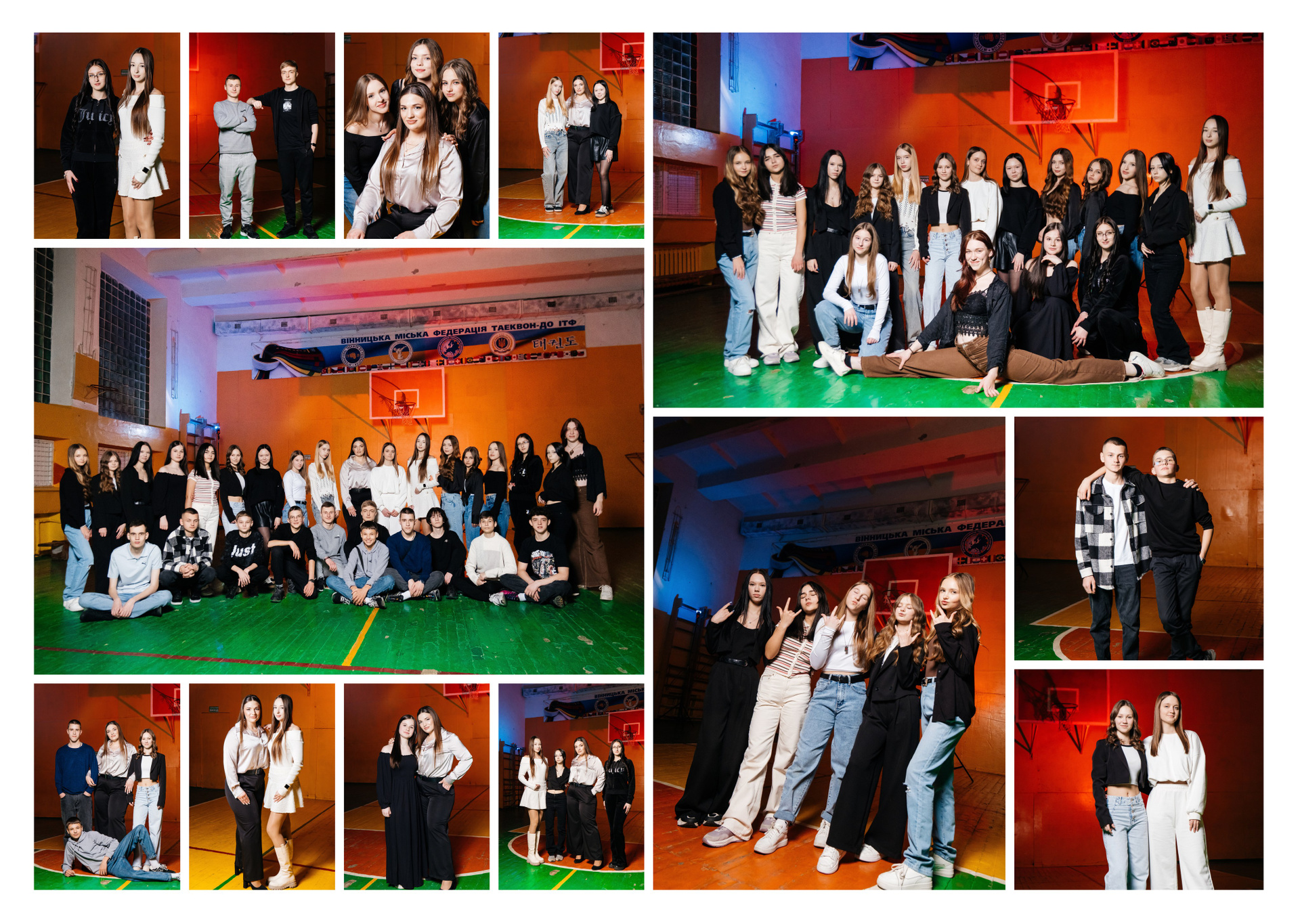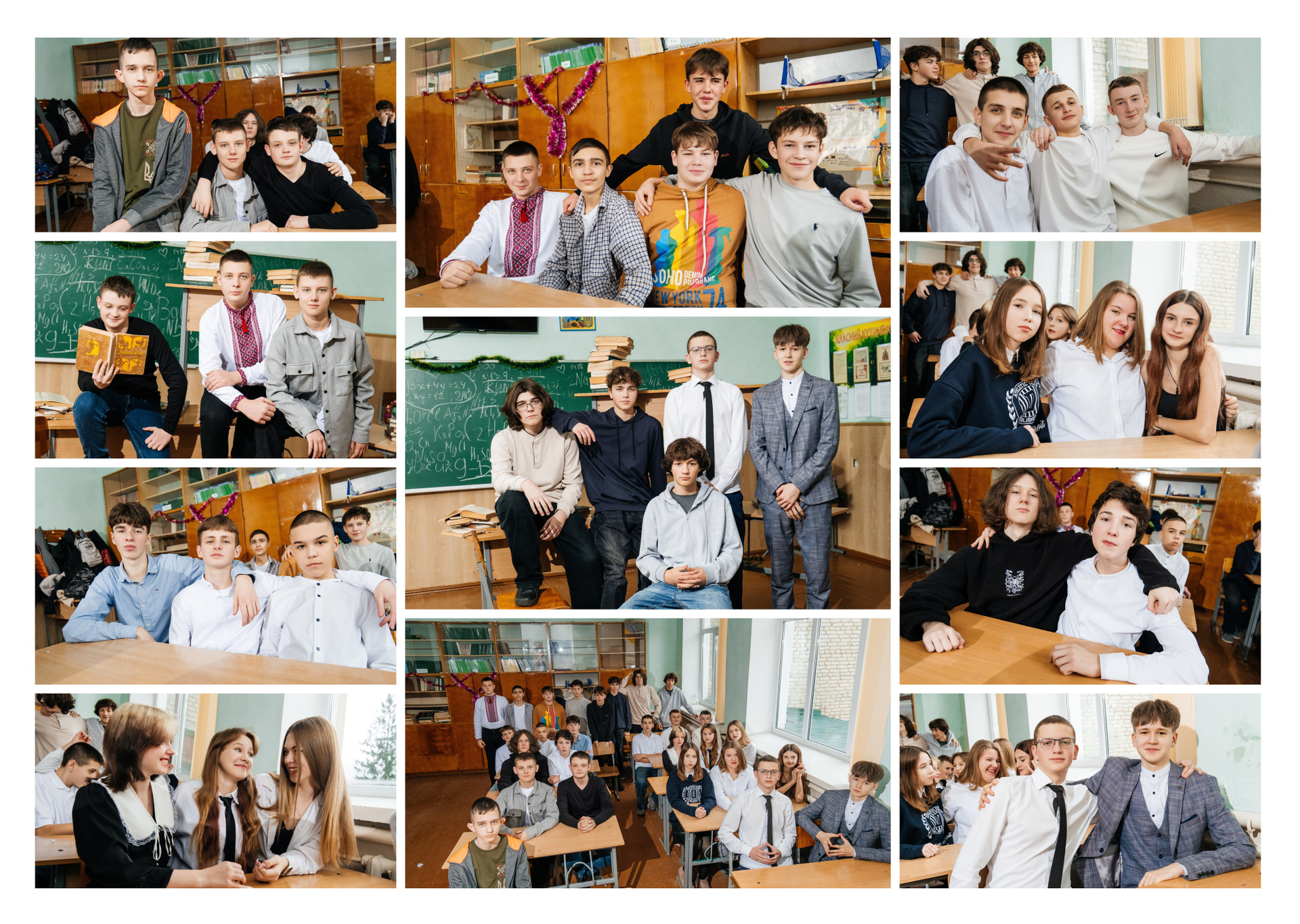 портрети можуть бути зняті на фоні (білий), на сьогоднішній день це найпоширеніший варіант, а також в інтер’єрі класу бібліотеки і т.д.