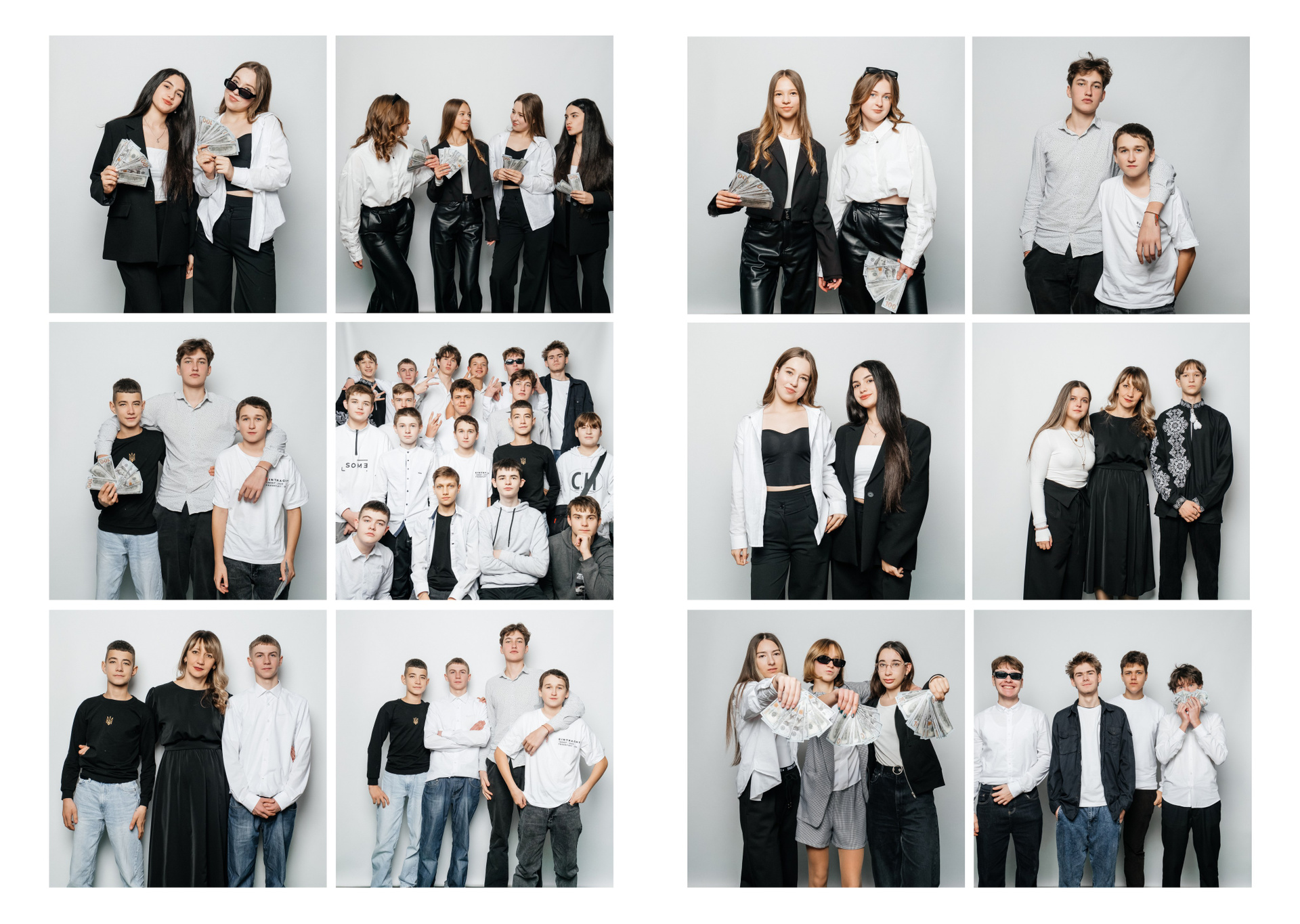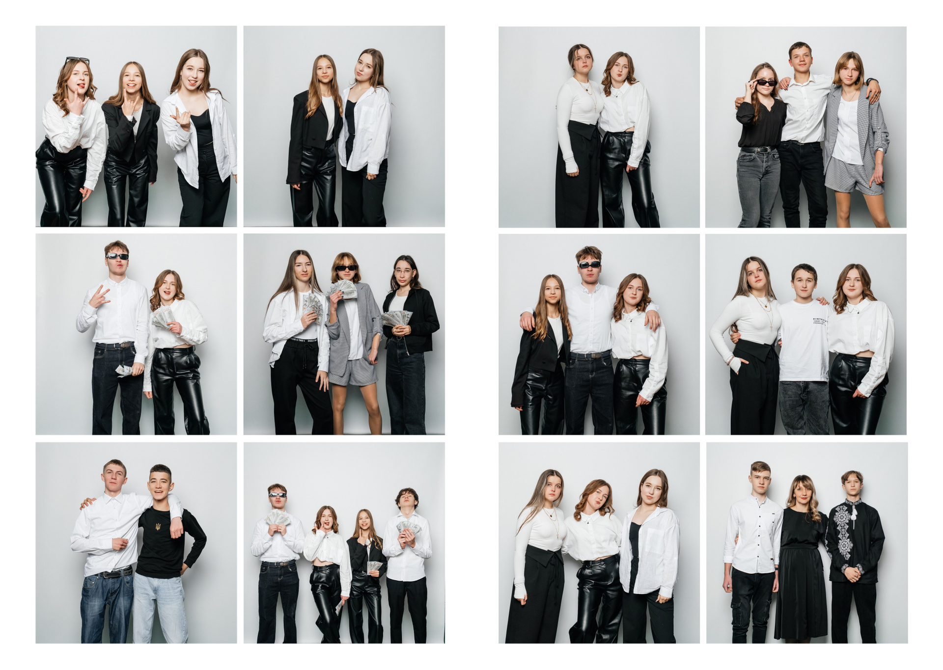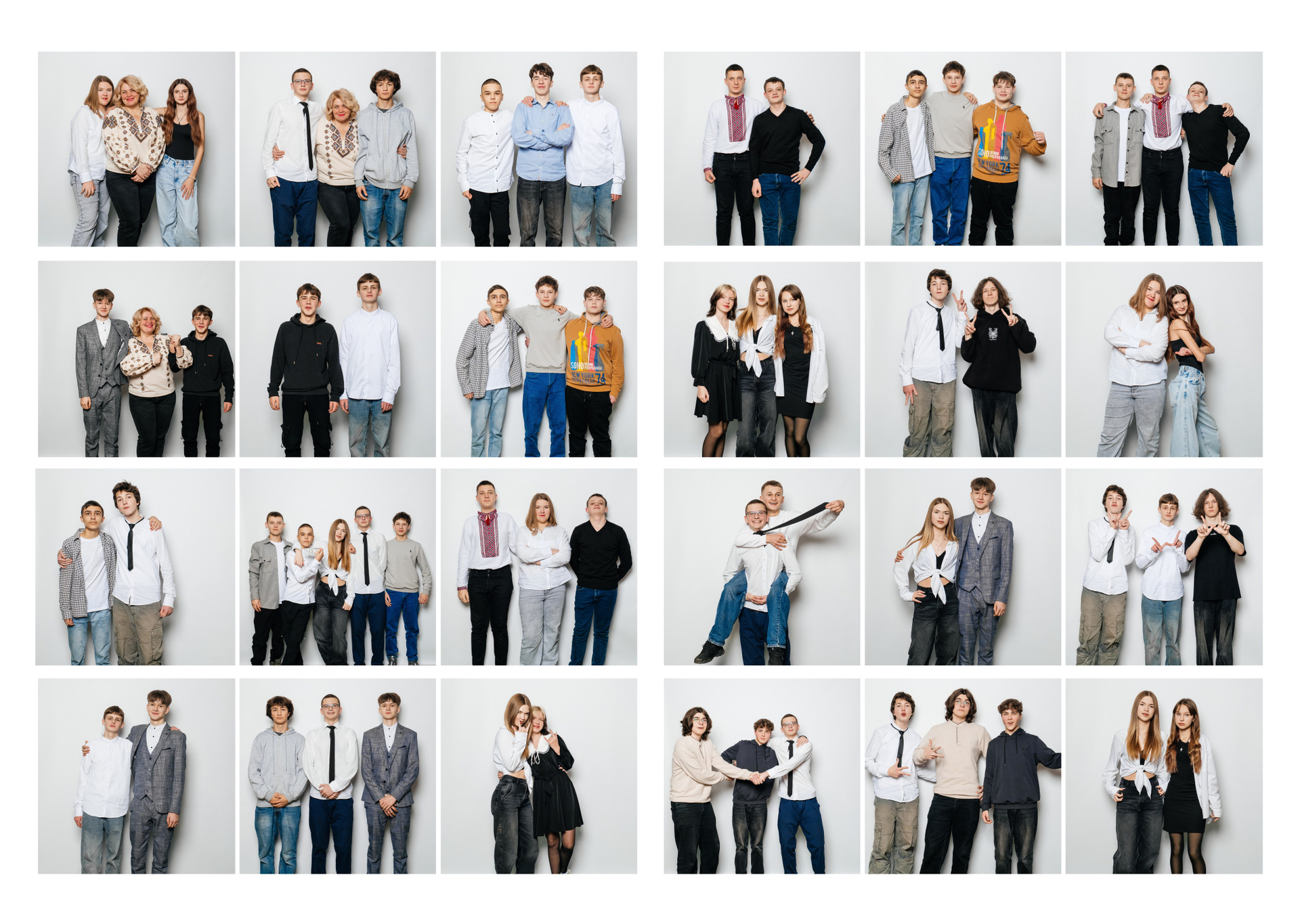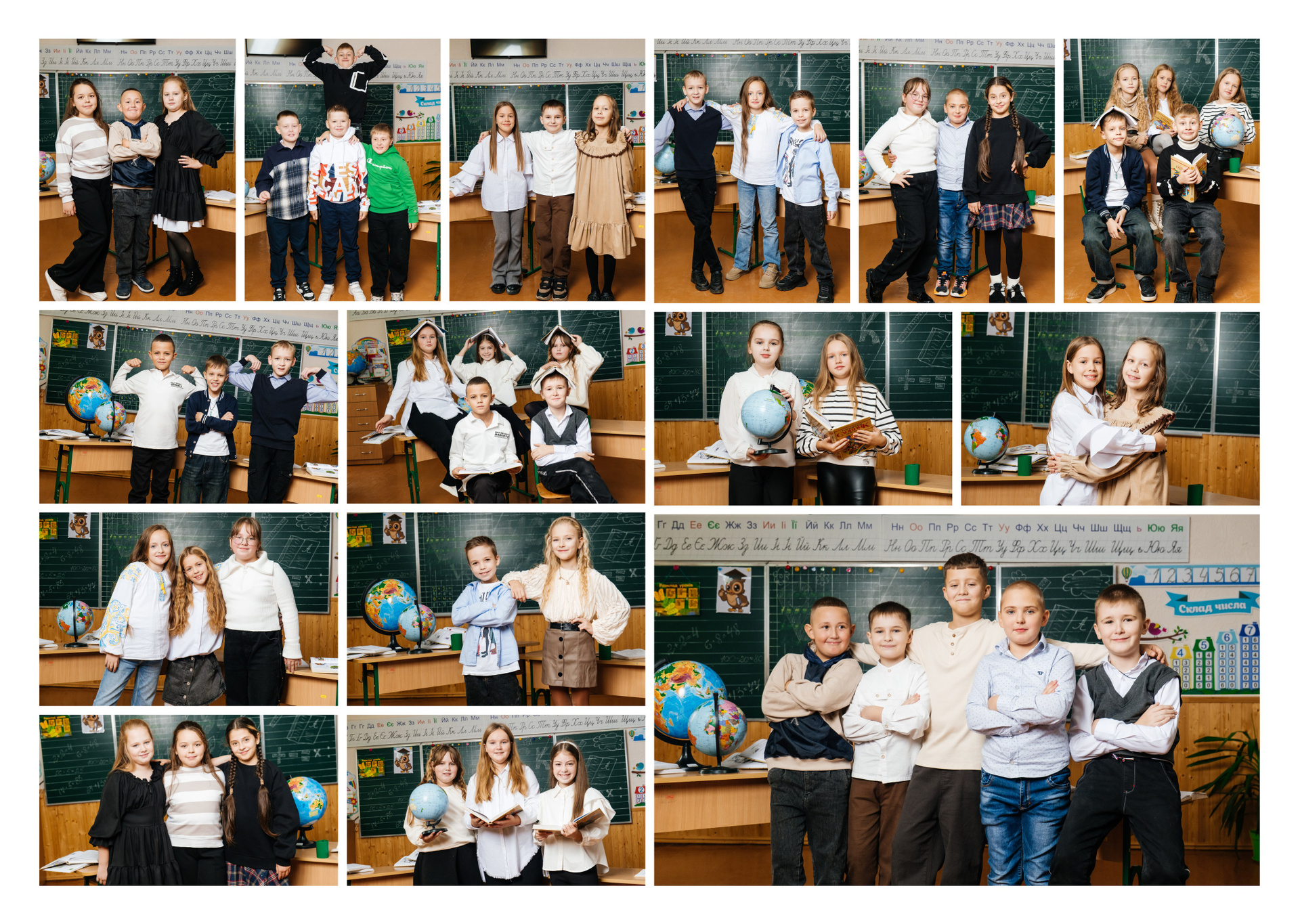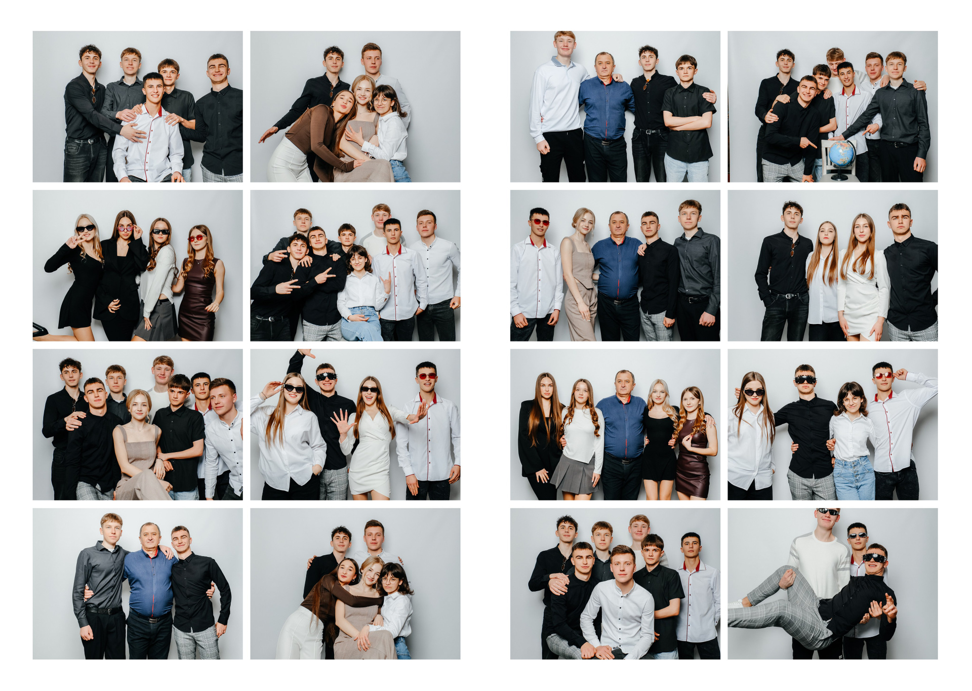 портрети можуть бути зняті на фоні (білий), на сьогоднішній день це найпоширеніший варіант, а також в інтер’єрі класу бібліотеки і т.д.