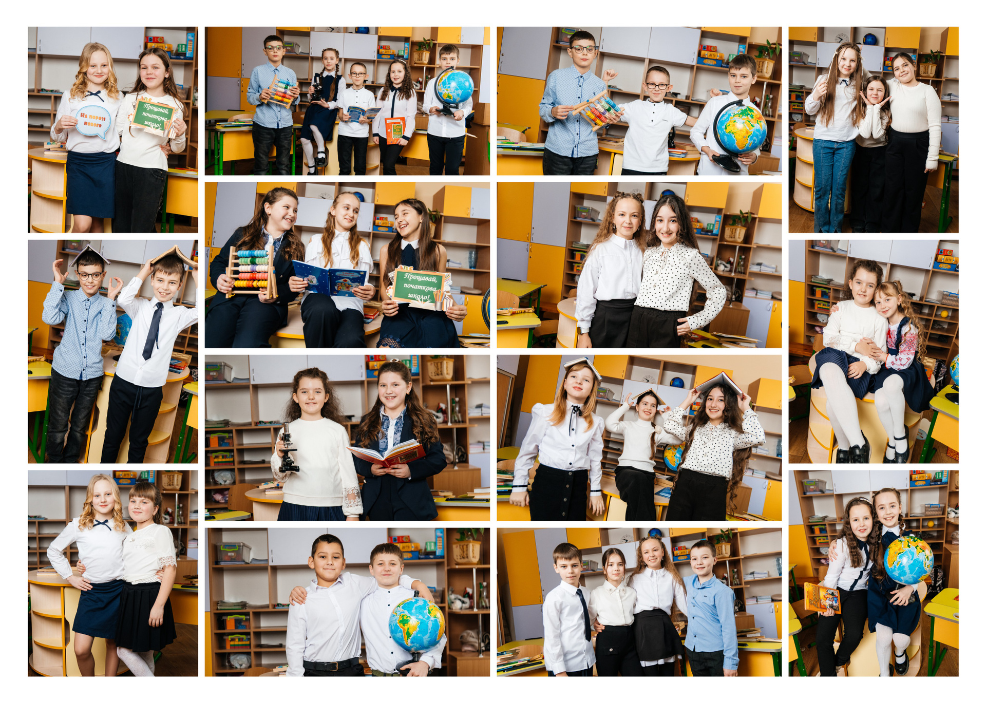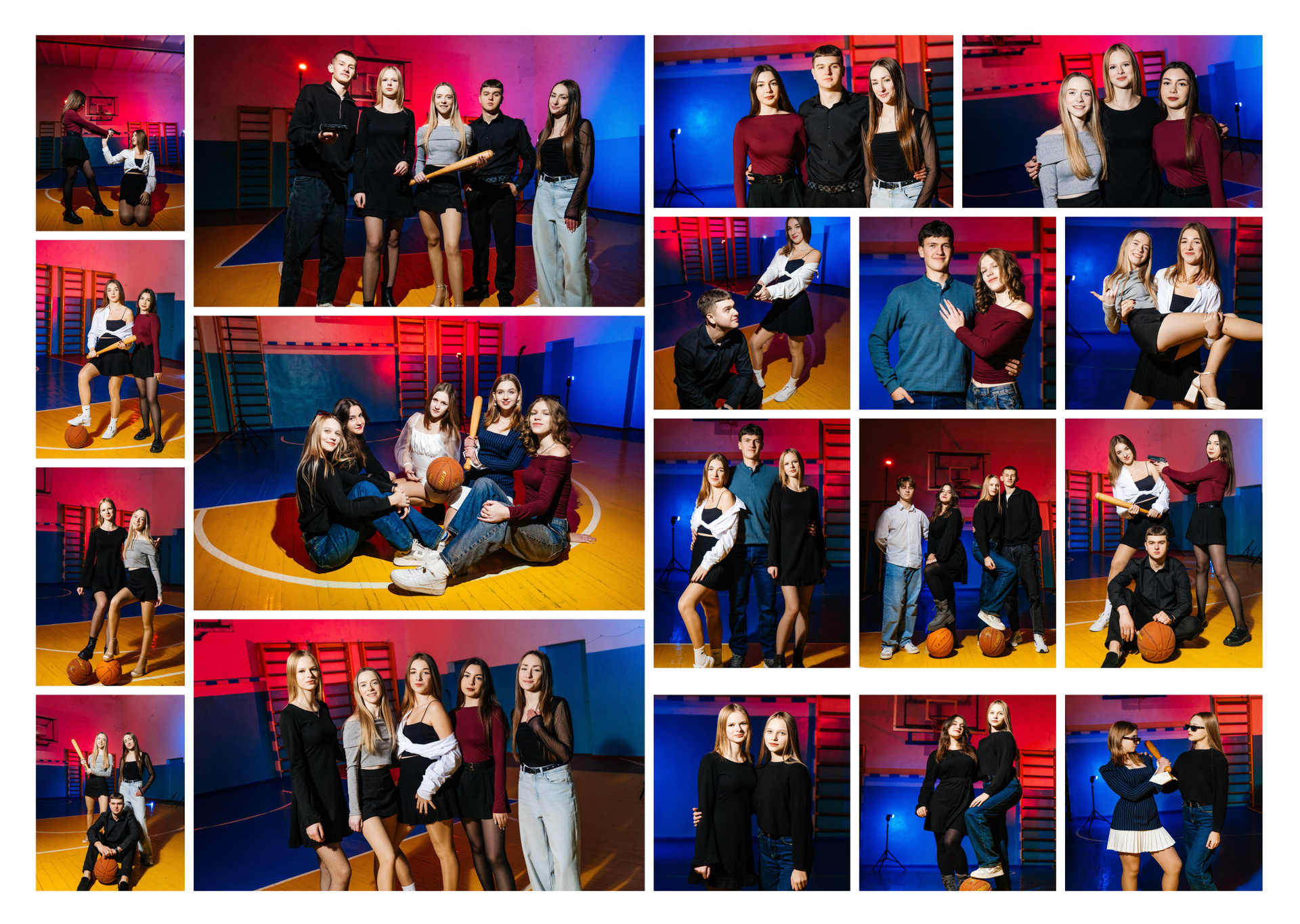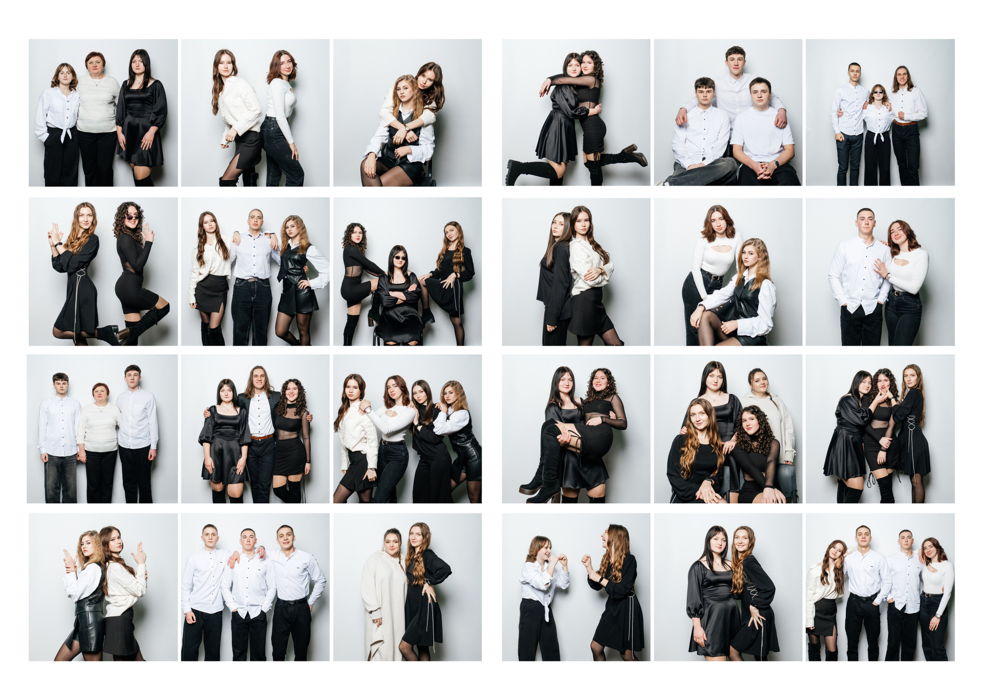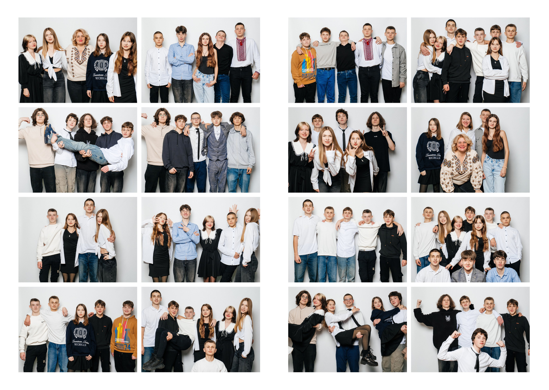 портрети можуть бути зняті на фоні (білий), на сьогоднішній день це найпоширеніший варіант, а також в інтер’єрі класу бібліотеки і т.д.